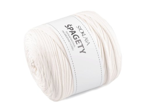 Špagetovú priadzu tvoria narezané prúžky látky z recyklovanej bavlny. Priadza je mierne elastická. Využijete ju na pletenie a háčkovanie koberčekov, diek, tašiek, šál, košíkov, batohov, obliečky na vankúše a pod. Je príjemná na dotyk, vhodná aj na pletenie rukami. >Veľkosť ihlíc: 9 Veľkosť háčika: 8 Varianty sú v základných farbách v rôznych odtieňoch (tmavšie, svetlejšie, melírované).