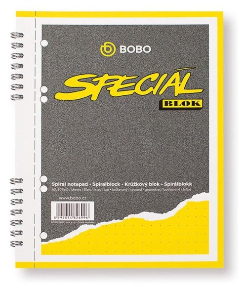 Krúžkový blok v praktickom formáte A5 je najlepší na školské zápisky. S bodkami sa navyše môžete vyhrať a svoje poznámky poriadne vytuniť. br Vďaka svojim vlastnostiam, ako je perforácia a dierovanie, sa tento blok stane všestranným pomocníkom pre všetkých, ktorí potrebujú uchovať svoje zápisky. br brTečkovaná lineatúra poskytuje veľa priestoru na tvorenie a kreativitu. Vyhrajte sa so svojimi poznámkami a popustite uzdu fantázie. Vaše zápisky razom dostanú úplne iný rozmer. br brPoznámkový blok Špeciál br• Formát: A5 br• Počet listov: 50 br• Lineatúra: Bodkovaná br• Gramáž: 70 g br• Väzba: Dvojitá krúžková Twin Wire br• Dierovanie pre zakladanie do zakladačov br• Perforácia stránok pre ľahké odtrh listov až o 360 ° bez posunutia stránok. Zápisník zostane otvorený na zvolenej stránke a (na rozdiel od šitých väzieb) sa nezavrie.
