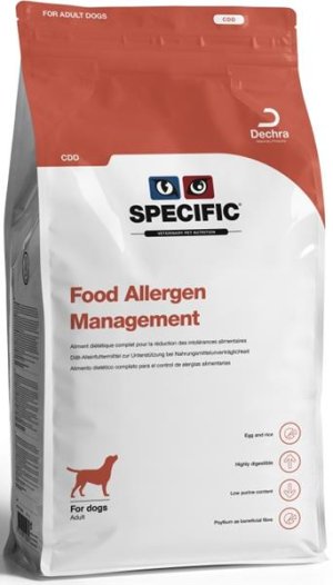 SPECIFIC ® Food Allergen Management je kompletné diétne krmivo pre dospelých psov, ktoré zmierňuje príznaky potravinovej intolerancie a intolerancie voči prísadám, kompenzuje poruchy trávenia a/alebo exokrinnú pankreatickú nedostatočnosť a redukuje tvorbu urátových kameňov. Diéta obsahuje obmedzené množstvo vybraných zdrojov proteínov a uhľohydrátov a obmedzený obsah proteínu s vysokou kvalitou a stráviteľnosťou. Diéta pokrýva všetky výživové potreby dospelých psov a prispieva k ich zdraviu. Potravinová alergia alebo intolerancia, gastrointestinálne problémy (hnačky, zvracanie, plynatosť), malabsorpcia a maldigescia, exokrinná pankreatická insuficiencia a urátová urolitáza (len CDD - obmedzené surovinové zloženie = vajcia a ryža). Indikácia