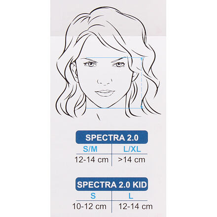 Potápačská maska Aqua-Speed Spectra 2.0 KID ponúka úplne nový pohľad na podvodný svet. Celotvárová maska Spectra Vám rozšíri obzory pri šnorchlovaní alebo potápaní v malých hĺbkach (pri zostupe do väčších hĺbok je nutné vyrovnávať tlak v ušiach, čo nie je v celotvárovej maske z dôvodu nedostatočného prístupu k nosu možné). Konštrukcia masky Spectra 2.0 KID je ale vhodná aj pre tých potápačov, ktorí považujú tradičné potápačské okuliare a šnorchel za nepohodlné alebo ich dokonca vôbec nemôžu používať . Masku Spectra tvorí plastová konštrukcia, súčasťou ktorej je tesnenie z vysoko kvalitného antialergénneho silikónového kaučuku (LSR). Tvar masky a vlastnosti umožňujú pohodlné prispôsobenie mnohým veľkostiam i tvarom tváre. Na presné usadenie a utesnenie slúžia dva široké, dĺžkovo nastaviteľné gumové pásky . Súčasťou masky je aj päť ventilov. Dva bočné ventily v úrovni očí napomáhajú prúdeniu vzduchu, dva ventily v úrovni nosa slúžia na minimalizáciu zahmlievania visora a ventil uložený v najnižšom bode masky je potom určený na vydychovanie. Ten slúži aj na odvod vody v prípade, že sa vo vnútri masky z nejakého dôvodu voda predsa len ocitne. Tu stačí iba zdvihnúť hlavu nad hladinu alebo priamo vo vode energicky vydýchnuť a nežiaduca voda odtečie. Neskreslený výhľad zaisťuje konštrukcia s minimálnym vnútorným objemom a proti slnečnému svitu mierne zafarbený visor z vysoko kvalitného odolného polykarbonátu. O prívod dostatočného množstva vzduchu a následný odvod vzduchu sa stará šnorchel so širokým prierezom. Ten je na svojom konci vybavený systémom Ultra-Dry, ktorý zabraňuje vniknutiu vody do dýchacej trubice. Šnorchel je možné ľahko zložiť, čo umožňuje jednoduchšiu prepravu aj uskladnenie. Maska Spectra 2.0 KID je balená v sieťovanom sťahovacom bagu. Ako zvoliť správnu veľkosť potápačskej masky Aqua-Speed Spectra? Tento model je k dispozícii v dvoch veľkostiach. Pokiaľ nemáte možnosť vyskúšať si masku pred zakúpením, použite nasledujúcu metódu na meranie veľkosti tváre: Zatvorte ústa a zmerajte vzdialenosť medzi okrajom brady a obočím. Ak je vzdialenosť menšia ako 12 cm, zvoľte veľkosť S. Ak je vzdialenosť väčšia, zvoľte veľkosť L.