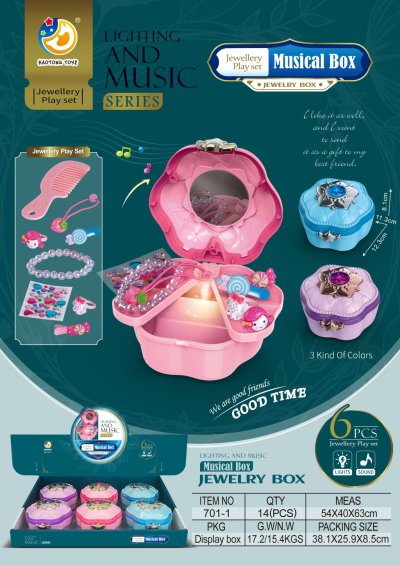 Táto šperkovnica so svetelným a zvukovým efektom je ideálna pre malé parádnice, ktoré majú rady krásne doplnky! Šperkovnica sa otvára a pri tom vydáva svetelné a zvukové efekty, čo pridáva na kúzle a zábave. Set obsahuje hrebienok, gumičku, sponku a ďalšie doplnky, ktoré sú skvelé na úpravu vláskov a vytvorenie rôznych účesov. Perfektné pre deti, ktoré sa rady hrajú na krásu a starostlivosť o vzhľad, a zároveň si užívajú kúzelný zážitok z otvárania šperkovnice!