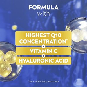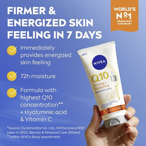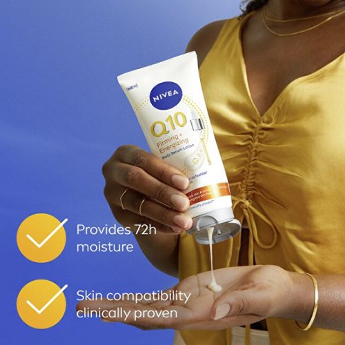 Toto inovatívne sérum spája intenzívnu účinnosť séra s hydratačnou starostlivosťou telového mlieka. Obsahuje najvyššiu koncentráciu koenzýmu Q10 v rámci telovej kozmetiky Nivea, ktorá podporuje tvorbu kolagénu a zároveň chráni pokožku pred oxidačným stresom. Spolu s vitamínom C a kyselinou hyalurónovou viditeľne zlepšuje vzhľad pokožky a dodáva jej zdravý jas a dlhodobú hydratáciu. Pokožka je pevnejšia a žiarivejšia už za 7 dní.