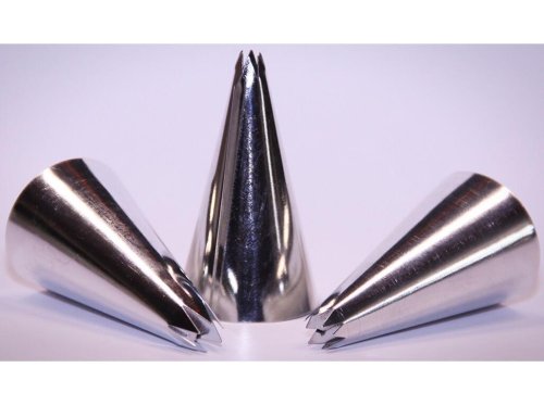 Balenie obsahuje 3 ks zdobiacich špičiek. Ideálny pomocník na zdobenie tort a dezertov. Špičky sa tiež hodia na pečenie a plnenie zákuskov a cukroviniek. Vyrobené z pocínovaného plechu. Pripravené na použitie s bavlneným cukrárskym vreckom. Vrecko nie je súčasťou balenia.