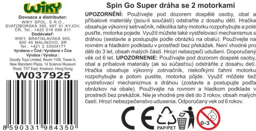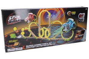Spin and Build Super dráha s 2 motorkami. S vystreľovacím zariadením. Dojazd motorky 50 m, na zotrvačník s gyroskopom. Veľkosť motorky 4,5 cm. Ďalšie motorky je možné zakúpiť samostatne (W037920, W037921).