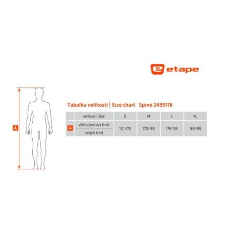 Chránič chrbta Etape SPINE sa skvele prispôsobí telu a zaistí tak maximálne pohodlie a bezpečnosť pre všetkých vyznávačov zimných športov, ktorí hľadajú kvalitnú ochranu a pritom kladú dôraz aj na komfort. Zárukou pre zaistenie maximálnej bezpečnosti je schválenie podľa európskej normy EN 1621-2. Do výbavy chrbtice patrí 4-vrstvová absorpčná pena ERGOFLEX 4X™ pre maximálnu ochranu, 3D ventilačný materiál na chrbte pre ideálny komfort, anatomický tvar, nastaviteľné anatomické popruhy a nastaviteľné elastické stiahnutie v páse. SPINE: - schválenie podľa normy STN EN 1621-2, trieda 1 - 4-vrstvová absorpčná pena ERGOFLEX 4X™ pre maximálnu ochranu - 3D ventilačný materiál na chrbte pre ideálny komfort - anatomický tvar a nastaviteľné anatomické popruhy - z elastického materiálu pre dokonalé pohodlie - nastaviteľné elastické stiahnutie v páse - so suchým zipsom Velcro Safe™ = 100% ochrana odevu Veľkosti / výška postavy: S (150-175 cm), M (170-180 cm), L (175-185 cm), XL (185- 195 cm) Materiál: 55% guma pena, 22% polyester, 20% polyamid, 3% ostatné. Údržba: perte v ruke v chladnej vode, sušte zavesené, nesušte v sušičke, nepoužívajte aviváž, nebielte, nežehlite, nečistite chemicky.