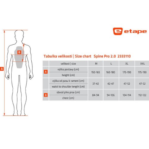 Chránič chrbta ETAPE Spine Pro 2.0 sa skvele prispôsobí telu a zaistí tak maximálne pohodlie a bezpečnosť pre všetkých vyznávačov zimných športov, ktorí hľadajú kvalitnú ochranu a pritom kladú dôraz aj na komfort. Zárukou pre zaistenie bezpečnosti je schválenie podľa európskej normy EN 1621-2. Maximálnu ochranu a pohodlie zaisťuje absorpčná pena FOAMFLEX 3DTM. Kombinácia materiálov Lycra a elastickej sieťoviny ponúka optimálnu ventiláciu. Vestu môžete prať samostatne vďaka vyberateľnej absorpčnej pene. Spine PRO 2.0: - schválenie podľa normy STN EN 1621-2, trieda 1 - absorpčná pena FOAMFLEX 3DTM pre maximálnu ochranu a pohodlie - predĺžená ochrana kostrče - kombinácia materiálov Lycra a elastickej sieťoviny pre optimálnu ventiláciu a pohodlie - protišmyková silikónová úprava v páse - nastaviteľné elastické stiahnutie v páse so suchým zipsom Velcro SafeTM = 100% ochrana odevu - možnosť vybratia absorpčnej peny a prania vesty Veľkosti / výška postavy: M (150 - 165 cm) L (160 - 180 cm) XL (175 - 190 cm) XXL ( 175 - 190 cm) Uvedené hodnoty sú iba orientačné as ohľadom na konkrétnu postavu sa môže vhodná veľkosť líšiť. Materiál: 40% polyuretán, 35% polyester, 25% polyamide Údržba: perte v ruke v chladnej vode, sušte zavesené, nesušte v sušičke, nepoužívajte aviváž, nebielte, nežehlite, nečistite chemicky.