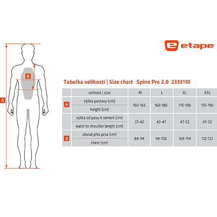 Chránič chrbta ETAPE Spine Pro 2.0 sa skvele prispôsobí telu a zaistí tak maximálne pohodlie a bezpečnosť pre všetkých vyznávačov zimných športov, ktorí hľadajú kvalitnú ochranu a pritom kladú dôraz aj na komfort. Zárukou pre zaistenie bezpečnosti je schválenie podľa európskej normy EN 1621-2. Maximálnu ochranu a pohodlie zaisťuje absorpčná pena FOAMFLEX 3DTM. Kombinácia materiálov Lycra a elastickej sieťoviny ponúka optimálnu ventiláciu. Vestu môžete prať samostatne vďaka vyberateľnej absorpčnej pene. Spine PRO 2.0: - schválenie podľa normy STN EN 1621-2, trieda 1 - absorpčná pena FOAMFLEX 3DTM pre maximálnu ochranu a pohodlie - predĺžená ochrana kostrče - kombinácia materiálov Lycra a elastickej sieťoviny pre optimálnu ventiláciu a pohodlie - protišmyková silikónová úprava v páse - nastaviteľné elastické stiahnutie v páse so suchým zipsom Velcro SafeTM = 100% ochrana odevu - možnosť vybratia absorpčnej peny a prania vesty Veľkosti / výška postavy: M (150 - 165 cm) L (160 - 180 cm) XL (175 - 190 cm) XXL ( 175 - 190 cm) Uvedené hodnoty sú iba orientačné as ohľadom na konkrétnu postavu sa môže vhodná veľkosť líšiť. Materiál: 40% polyuretán, 35% polyester, 25% polyamide Údržba: perte v ruke v chladnej vode, sušte zavesené, nesušte v sušičke, nepoužívajte aviváž, nebielte, nežehlite, nečistite chemicky.