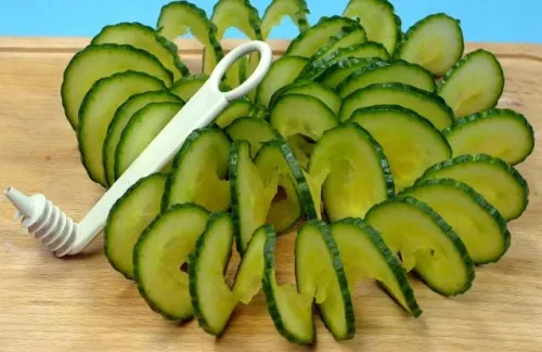 Ozdobnou špirálou nazdobíme zeleninu do tvaru skrutkovice a takto zdobíme šaláty alebo obložené zeleninové misy. Špičku uhorky odrežeme a držíme vo zvislej polohe, hrot so závitom natáčame do stredu uhorky, prst vložíme do očka a krúživými pohybmi pripravíme špirálu. Český výrobca. EAN 8594011950734