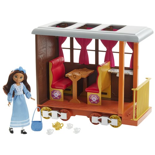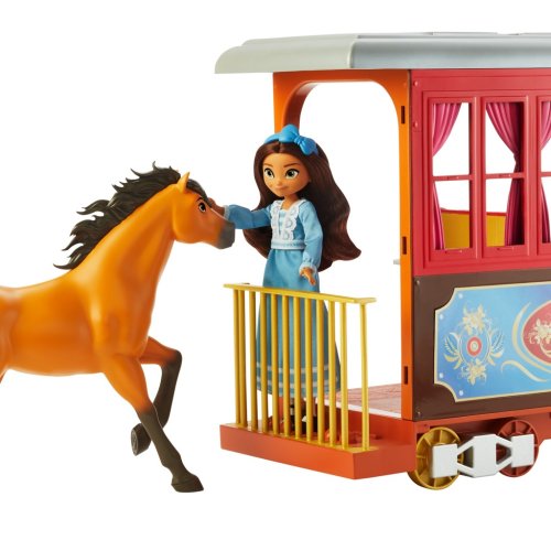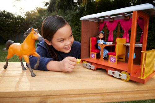 Buďte súčasťou všetkého toho priateľstva, statočnosti a dobrodružstvo s animovaným filmom Spirit od DreamWorks! Herný set Lucky 's Train Home obsahuje bábiku Smejko (približne 7 palcov / 17,78 cm) v rozkošných dlhých šatách na jej ceste vlakom domov! Vlak má kolieska, ktoré sa otáčajú, otvára sa a zväčší sa na 15 × 7 × 11 palcov (dĺžka x hĺbka x výška) pre 360-stupňový hru. Herný set obsahuje aj cestovný príslušenstvo a príslušenstvo pre podávanie čaju a dezertu pri jazde vlakom. Farby a dekorácie sa môžu líšiť.