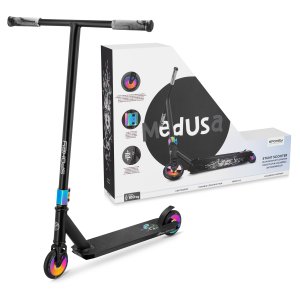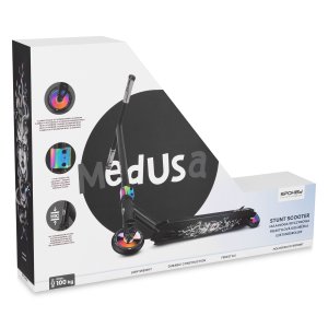 Medusa je freestylová kolobežka so zosilnenou, ale zároveň ľahkou konštrukciou a unikátnym dizajnom, ideálna pre začiatočníkov aj pokročilých jazdcov. Prvky s povrchovou úpravou Rainbowfinish a holografická nášľapná doska od umelkyne Izy Dudzik zaručujú, že kolobežka vyniká estetikou aj funkčnosťou.
