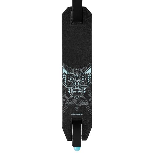 Kolobežka je vybavená 3-bodovou objímkou, ktorá zaručuje stabilitu konštrukcie, čo je kľúčové pri vykonávaní trikov. Kolieska s priemerom 100 mm, vyrobené z odolného PU/PP materiálu, v kombinácii s ložiskami ABEC-7, zaisťujú plynulú a dynamickú jazdu. Gumové gripy poskytujú komfort a jednodielne riadidlá T-Bar poskytujú plnú kontrolu nad kolobežkou.