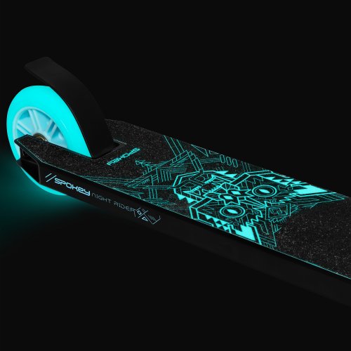 Freestyle kolobežka Spokey Night Rider je ideálnou voľbou pre začínajúcich a stredne pokročilých jazdcov. Vyznačuje sa zosilnenou konštrukciou a zároveň nízkou hmotnosťou. Protišmyková nášľapná doska s fosforeskujúcim povrchom , ktorý svieti v tme , zaisťuje nielen štýl, ale aj lepšiu viditeľnosť pri jazde.