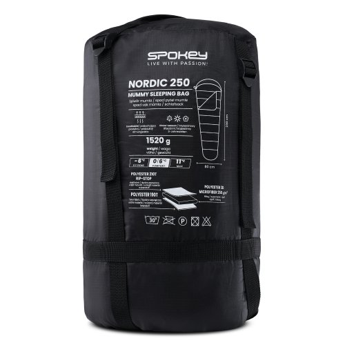 Spací vak Spokey NORDIC 250 je nevyhnutnou súčasťou vybavenia počas kempovania . Je vyrobený z tých najkvalitnejších materiálov, vďaka čomu má zvýšenú odolnosť proti mechanickému poškodeniu a roztrhnutiu. Použitá výplň 3D Microfibre zaisťuje dokonalú tepelnú izoláciu. Spací vak dokonale chráni pred chladom a skvelé sa hodí pre chladné jarné či jesenné noci . NORDIC 250 je zabalený v kompresnom vaku a váži iba 1520 g , vďaka čomu nezaberá veľa miesta v batohu a nepredstavuje žiadnu zbytočnú záťaž.