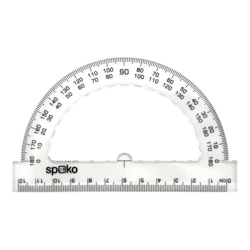 Školský uhlomer na meranie a určenie rysovaných uhlov do 180°. Stredový bod pre presnejšie meranie daného uhla. Predtlačená stupnica, dĺžka pravítka 12 cm. • mierka: 12 cm; rozsah uhla 180° • materiál: pevný a odolný polystyrén • predtlačená stupnica • transparentná