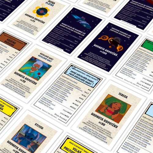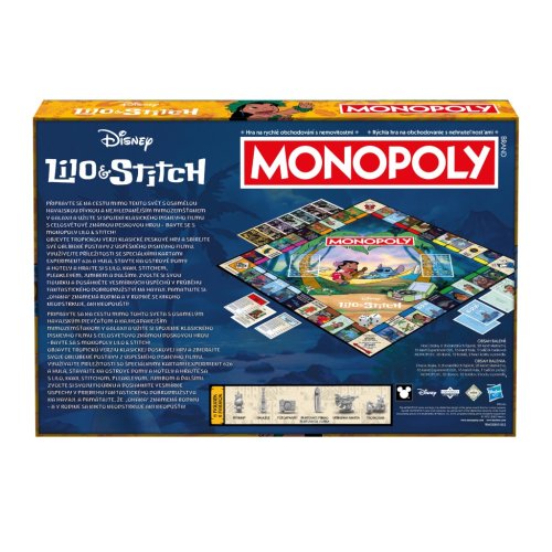 Obľúbená stolná hra Monopoly v originálnom dizajne inšpirovanom rozprávkou Lilo a Stitch. Hráči nakupujú a predávajú lokácie z havajského sveta Lilo a jej mimozemského kamaráta, zbierajú nájomné a snažia sa stať najbohatším hráčom. Obsahuje herný plán, figúrky, karty a herné peniaze s motívmi z filmu. Česká a slovenská verzia pravidiel.