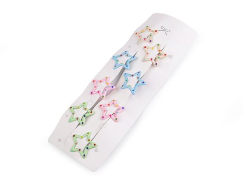 Malé sponky pukačky s hviezdou sa hodia do jemných detských vláskov. Udrží aj jemný pramienok vlasov. Sú vyrobené z kvalitného materiálu, ktorý dlho drží svoj tvar, funkčnosť aj farby. Na každej karte je 8 ks sponiek po 4 pároch. Papierová karta má výsek na zavesenie a vystavenie sponiek na predajný stojan.