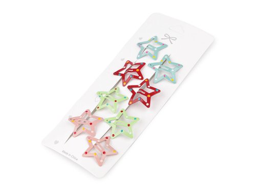 Malé sponky pukačky s hviezdou sa hodia do jemných detských vláskov. Udrží aj jemný pramienok vlasov. Sú vyrobené z kvalitného materiálu, ktorý dlho drží svoj tvar, funkčnosť aj farby. Na každej karte je 8 ks sponiek po 4 pároch. Papierová karta má výsek na zavesenie a vystavenie sponiek na predajný stojan.