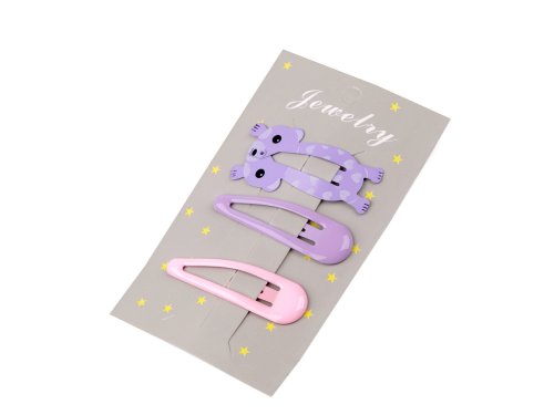 Sada tematických sponiek pukačiek poteší malé aj väčšie slečny. Na každej karte sú 3 sponky. Jedna je s motívom, ďalšie dve sú rovné, rôzne farebné, aby navzájom všetky sponky ladili. Sponky sú vyrobené z kvalitného materiálu, ktorý dlho drží svoj tvar, funkčnosť aj farby. Karta je opatrená výsekom na zavesenie a vystavenie na predajný stojan.