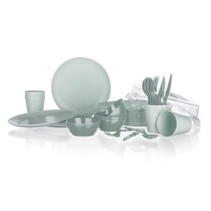 Praktická kempingová sada TRAVEL obsahuje 4x plastové taniere 23,5 cm, 4x plastové kelímky 250ml, 4x plastové lyžice 18,8 cm, 4x plastové vidličky 18,5 cm, 4x plastové nože 18,7 cm, 4x plastové misky 25.