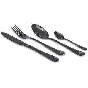 Skladacia kempingová príborová sada z nerezovej ocele s hliníkovými držadlami, 300D polyester Vrátane vidličky, noža a lyžice v čiernom obale Rozmer: 11 x 7 x 2 cm
