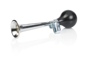 klasický klaksón v retro štýle zábavná alternatíva k zvončeku, najmä v prípade detských bicyklov s kovovou sponou pre jednoduchú montáž na riadidlá pochrómované kovové puzdro