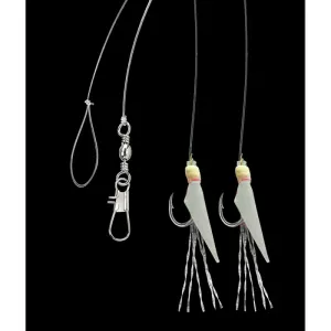 Morský náväzec s dvoma háčikmi veľkosť 8 potiahnutými pravou rybou kožou.