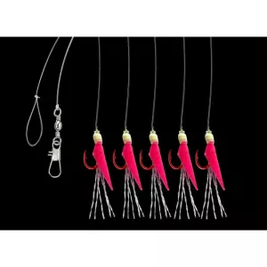 Morský náväzec s piatimi háčikmi veľkosť 12 potiahnutými pravou rybou kožou vo farbe pink.