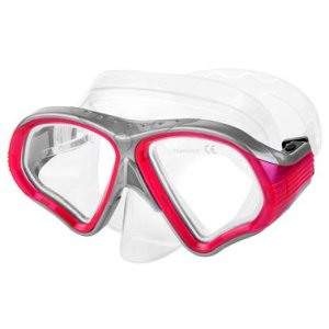 Dámska maska na potápanie; - okuliare zosilnené TG sklo; - lícnice a opasok silikón; - rám PC; Dámska maska na potápanie s menšou lícnicou a štíhlejším rámom.