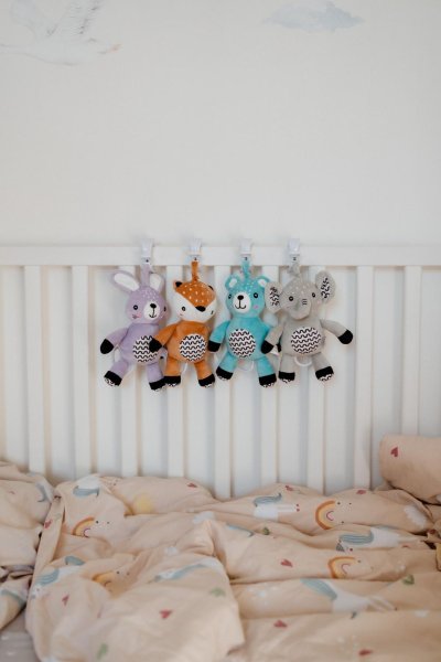 Hebučký plyšový srnček s naťahovacím hracím strojčekom je perfektný spoločník pre bábätká už od narodenia. Po zatiahnutí začne prehrávať jemnú uspávanku, ktorá pomáha bábätku upokojiť sa, relaxovať a pohodlne zaspať. Vďaka praktickému závesnému klipu je možné hračku ľahko pripevniť na postieľku, kočík, autosedačku alebo hraciu hrazdičku. Srnček je tak vždy na dosah a sprevádza dieťatko doma aj na cestách. Vyrobený z mäkkého, príjemného plyšu, ktorý je vhodný pre najmenšie deti. Kontrastné vzory na brušku a jemné detaily podporujú vizuálne vnímanie bábätiek. Hračka je certifikovaná v SR, čo garantuje vysoký štandard bezpečnosti pre novorodencov.