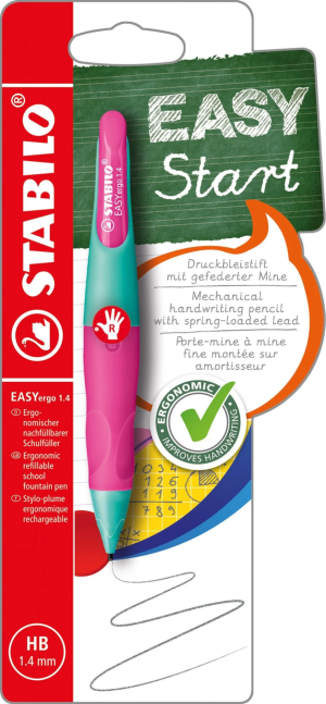Grafitová ceruzka STABILO EASYergo je špeciálne určená pre školákov, ktorí sú v písaní už pokročilejší. Je ergonomicky tvarovaná a vybavená príjemnou úchopovou zónou vyrobenou z nekĺzavého materiálu, ktorá zodpovedá veľkosti detskej ruky a intuitívne ju navádza k správnemu úchopu. Na písanie a kreslenie je tak potrebné vyvíjať iba minimálny tlak. Ceruzka disponuje aj stiskacím mechanizmom a odpruženou špičkou. Tuha o tvrdosti HB vytvára stopu o šírke 1,4 mm a nie je ju nutné orezávať. STABILO EASYergo umožní deťom skutočne pohodlné písanie.