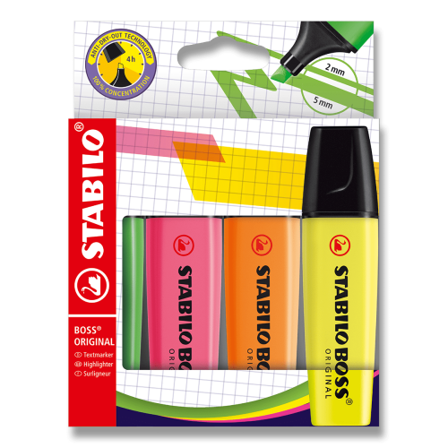 Zvýrazňovače s klinovým hrotom, šírka stopy 2-5 mm s reflexným atramentom na univerzálne použitie na všetkých druhoch papiera. Vydrží až 4 hodiny bez viečka. Balenie obsahuje 4 fluorescenčné farby (žltá, ružová, zelená, oranžová).