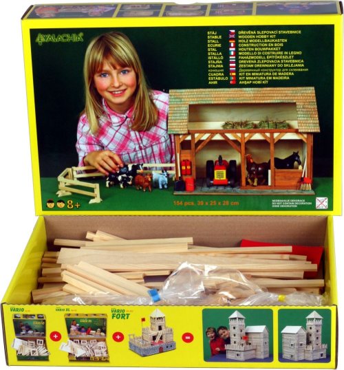 Drevená zlepovacia stavebnica Walachia - Stajňa. Zlepovacia stavebnica Walachia sú drevené modely domčekov a stavieb z Valašského kraja v mierke 1:32. Základom sú drevené hranolčeky 9x9 mm ak tomu sú v sade vždy všetky papierové doplnky - okná, dvere, strešné časti atď. Na lepenie sa používa lepidlo Herkules, nie je však súčasťou stavebnice. Priložený je montážny návod a malé kapitoly z histórie ľudovej architektúry. Rozmery: 39 x 25 x 28 cm. Počet dielov stavebnice: 154