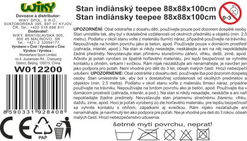 Farebný stanový úkryt pre skvelú zábavu a aktívne hry Veľký vstupný otvor a okno zaisťujú dobré vetranie vnútorného priestoru stanu Látkový stan s jednoduchým a rýchlym spôsobom rozloženia aj zloženia Stan s indiánsky ľahkou a stabilnou konštrukciou Vyrobený z ľahko umývateľného, ľahkého a vodotesného materiálu v interiéri aj v exteriéri Ľahko skladovateľný (zložený nezaberie veľa miesta) Rozmery stanu (d × š × v): 88 × 88 × 100 cm Materiál: 100% polyester