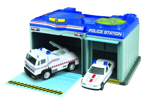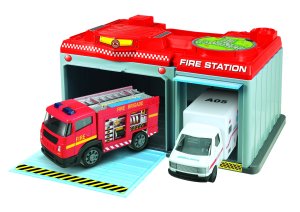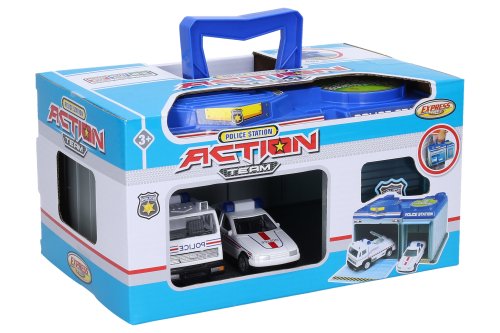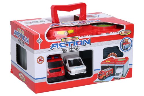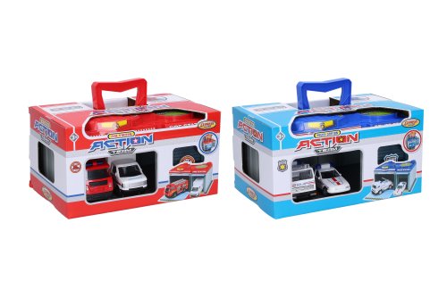 Stanica prenosná s 2 kovovými autami. Rozmery stanice 24x15,5x12,5 cm, veľkosť áut 13 cm. Materiál áut kov/plast. 2 varianty - hasiči, polícia.