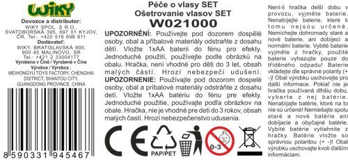Starostlivosť o vlasy set. Balenie obsahuje - fén s efektmi, natáčky, sponky, opasok s kapsičkami, nožnice, hrebeň, golier, kefa, fľaštička. Fén - 1xAA, nie je súčasťou.