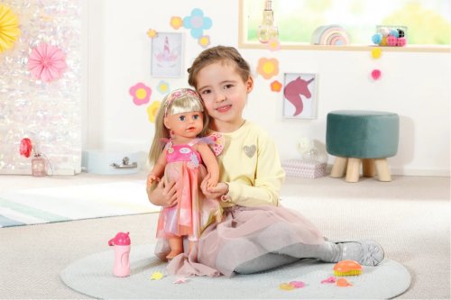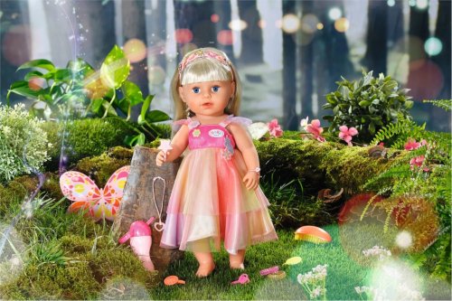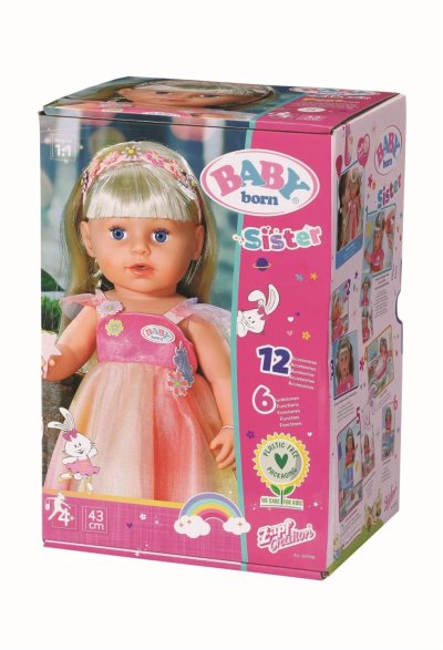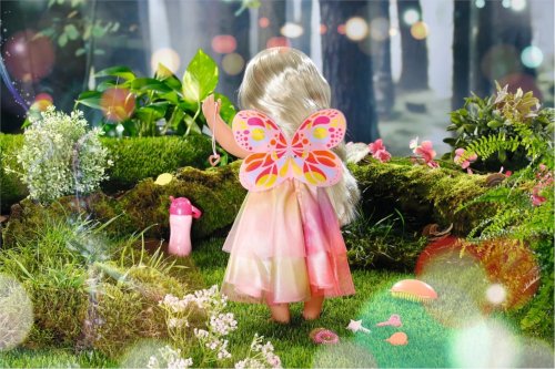 Staršia sestrička BABY born víla je očarujúca bábika. V tylovej sukienke v dúhových farbách a trblietavom tope vyzerá ako naozaj rozprávková víla. Z dlhých blonďavých vláskov sa dajú vytvoriť najrôznejšie účesy. Stačí použiť kefu, dve špirálové gumičky a sponky. Čelenka s kvetinovými ozdobami účes ešte viac zvýrazní. Bábika s telíčkom z mäkkého a príjemného materiálu Soft Touch má ohýbateľné kolená a keď čaká na jednorožke v kúzelnom lese, dokáže aj sama stáť. Všade so sebou berie fľaštičku na vodu s trblietavým viečkom. Po napití sa sestrička môže trochu rozplakať, napríklad pokiaľ sa v lese kúzelný jednorožec neobjaví. Staršia sestrička BABY born: • So 6 realistickými funkciami pre veľa zábavy. • Padne jej všetko oblečenie BABY born veľkosti 43 cm. •Rôzne hry s bábikou BABY born povzbudzujú predstavivosť a bolo preukázané, že podporujú rozvoj spoločenských zručností a hodnôt, ako je zodpovednosť, komunikácia a empatia. • Funguje bez batérií. Staršia sestrička BABY born, 43 cm je oblečená do šiat. Súčasťou balenia je fľaštička, kefa na vlasy, 2 špirálové gumičky, 2 sponky do vlasov, fľaštička na pitie, krídla a 2 náramky priateľstva - pre bábiku a jej malú mamičku. Vhodné pre deti od 4 rokov.