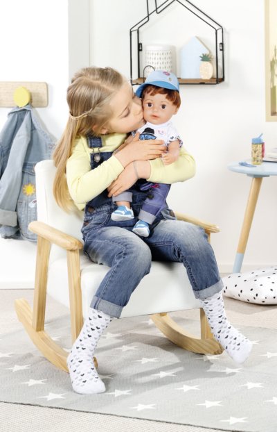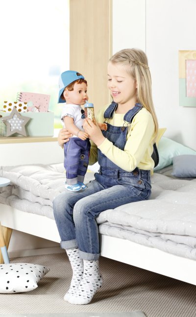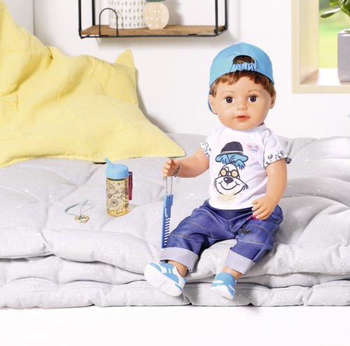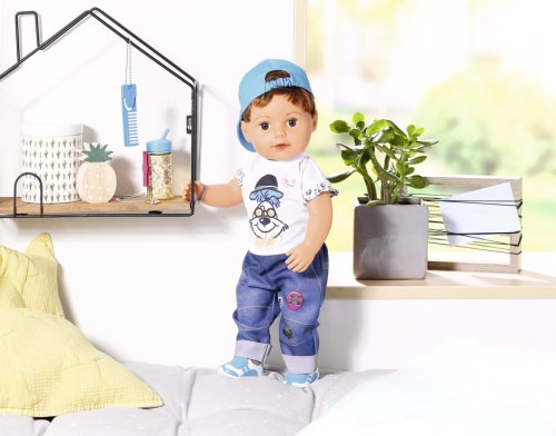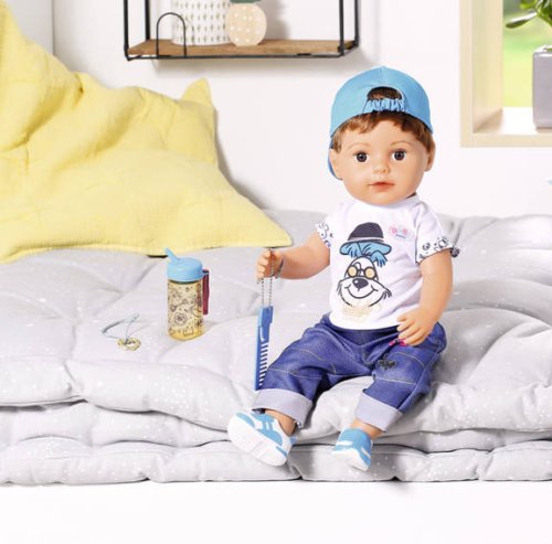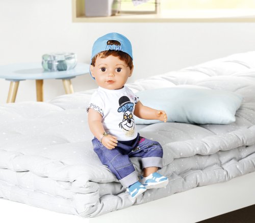 To je ale nezbedník! Staršie braček BABY born už zase svoje sestričke ukradol kefa na vlasy. A to má na svoje rozstrapatené vlásky vlastné hrebeň. Kto by ale odolal jeho uličnickému výrazu a nezbednému pohľadu? Chlapček má telíčko z príjemného "Soft Touch" materiálu a je stále v pohybe. Má nôžky s ohybnými kolenami a nosia moderné tenisky, ktoré ho odnesú všade tam, kam práve potrebuje. Zastaví sa len, keď má smäd a chce sa napiť zo svojej fľaštičky. Zo všetkého najradšej nosí džínsy a biele tričko s obrázkom psíka Bella. Ako správny nezbedník nosí šiltovku šiltom dozadu. Presvedčiť ho, aby si ju dal dole, nie je vôbec jednoduché. Niekedy sa kvôli tomu dokonca aj rozplače. Na všetko ale zabudne, hneď ako sa stretne so svojimi súrodencami pri bazéne. Vek 4+