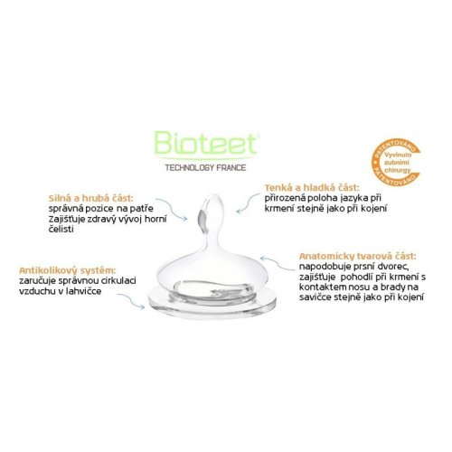 Inovatívna cumlík Bioteet vyniká svojim tvarom a povrchom, maximálne sa prispôsobuje detským ústam, napodobňuje tvar materskej bradavky v detskej puse, u dieťaťa zaisťuje vynakladanie rovnakého úsilia ako pri dojčení, a tým napomáha správnemu vývinu zubov. Vďaka svojmu asymetrickému tvaru a starostlivo navrhnutej hrúbke zaručuje cumlík Bioteet prirodzené tempo prietoku mlieka, prirodzené dýchanie nosom, správnu frekvenciu a spôsob prehĺtania a zabraňuje miešaniu vzduchu do mlieka.