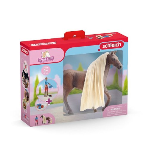 A prvé miesto získavaáááá… Leo a Rocky zo štartovacej sady Schleich® HORSE CLUB Sofia's Beauties. Takéto oznámenie z počuješ z reproduktorov pomerne často. Niet divu, pretože plne pohyblivá figúrka Lea a jeho koňa plemena Rocky Mountain s kefovateľnou hrivou sú pravým víťazným tímom. Nielen z drezúry, ale aj zo skokov cez prekážky si obvykle privezú domov zlato. Vďaka tvojej pomoci tiež radi trénujú na tých najhrboľatejších tratiach a skáču zo zeme na zadné sedadlo. Žrebec sa hrdo rozkročí nad stolom a predvedie svoju hrivu. Rýchlo, je čas pripraviť sa na odovzdávanie cien! To ale nie je najmenší problém, pretože hrivu a chvost môžeš ľahko a rýchlo vymeniť. Potom už stačí len narovnať farebné sponky a korálky do hrivy… a slávnostné odovzdávanie cien môže začať. Sada obsahuje: 1× kôň plemena Rocky Mountain s kefovateľnou hrivou a chvostom, 1× plne pohyblivá figúrka Lea, 1× deka pre kone, 1× jazdecký klobúk, 1× sponky do hrivy, 1× korálky do hrivy, 1× príčesok, 1× × kefa. Rozmery: 18,7 x 24,5 x 6 cm Vek: 3+