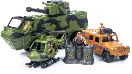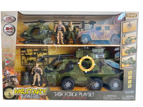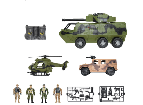 Veľká sada vojenských vozidiel so zvukovými a svetelnými efektmi. Sada obsahuje obrnený transporter, helikopter, jeep, vojačikov a salšie príslušenstvo.
