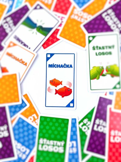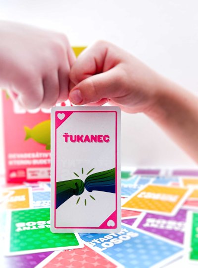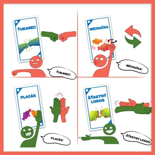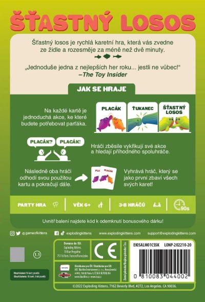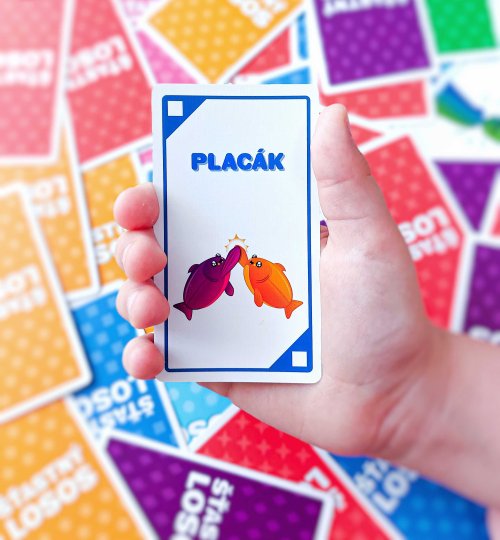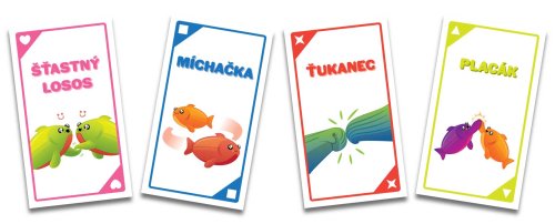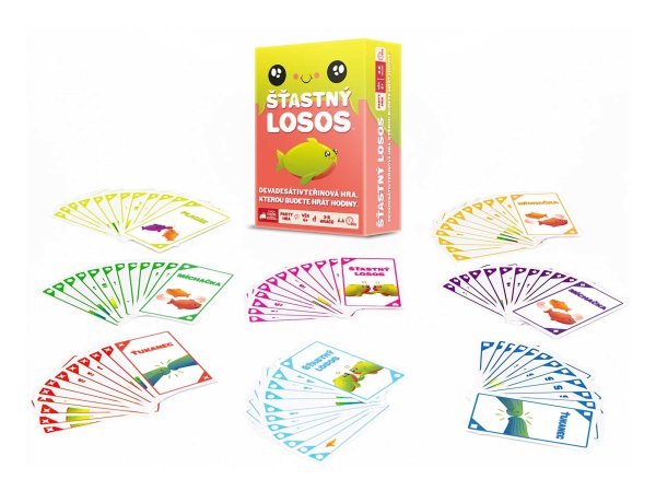 Šťastný losos je rýchla, pohybová a HLASITÁ hra, ktorá vás rozosmeje za menej ako dve minúty. Takže vypracte priestor, zbavte sa stoličiek a ak vám srdcový tep vyskočí na 120 úderov za minútu, najskôr to robíte dobre. Ako na hru? Na každej karte je jednoduchá akcia, ku ktorej budete potrebovať parťáka. Hráči zbesilo vykrikujú svoje akcie a hľadajú príhodného spoluhráča. Akonáhle ho nájdu, vykonajú spoločnú akciu, odhodia použitú kartu a pokračujú ďalej. Vyhráva hráč, ktorý sa ako prvý zbaví všetkých svojich kariet! Ak z nejakých, iste dobrých, dôvodov potrebujete byť pri hraní potichu, vyskúšajte tichý variant hry, ktorý sa skvele hodí do prepchaných barov, knižníc a iných miest, z ktorých boli naši testeri vykopnutí .Obsah balenia:96 kartové pravidlá