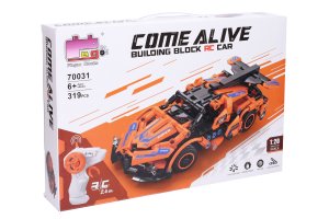 Stavebnica Auto oranžové RC na diaľkové ovládanie. 319 dielikov. Rozmery 18,6x8,8x5,6 cm. Pištoľový ovládač. Frekvencia 2.4GHz. Batériový pack 3.7V 350mAh Li-ion do auta súčasťou, 2xAA do ovládača nie sú súčasťou. USB kábel súčasťou. Prepínač ON/OFF na spodnej strane auta a na bočnej strane ovládača. Obrázkový návod bez textu a nálepky súčastí.