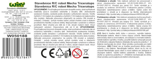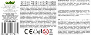 Stavebnica RC dino robot Mecha Triceratops. Rozmery zloženého robota 23,7x12,8x13,2 cm. Frekvencia 2,4 GHz. Vydáva zvukové efekty. Ovládanie - ľavé tlačidlo - pohyb dopredu, pravé tlačidlo - pohyb dozadu, prostredné tlačidlo - zvukové efekty. Schéma na zostavenie na obale. Pohyblivý chvost a hlava. Sada obsahuje 47 dielov. Robot - 2xAAA batérie, nie sú súčasťou. Ovládač - 2xAAA batérie, nie sú súčasťou.