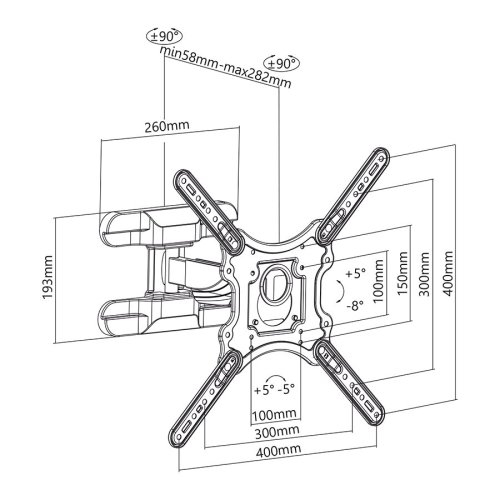 Jedná sa o veľmi praktický držiak určený na použitie s televízormi s uhlopriečkou 23“ až 70“ s maximálnou možnou hmotnosťou 40 kg. Držiak je vybavený praktickým polohovacím systémom, takže si televízor jednoducho nastavíte tak ako potrebujete. Televízor na držiaku je možné sklopiť dole o 8°, natočiť do strán o +/- 90°.