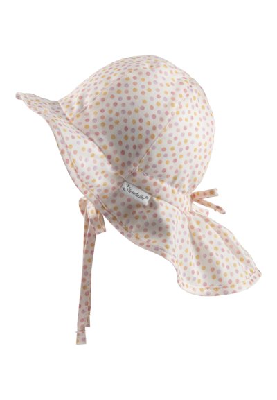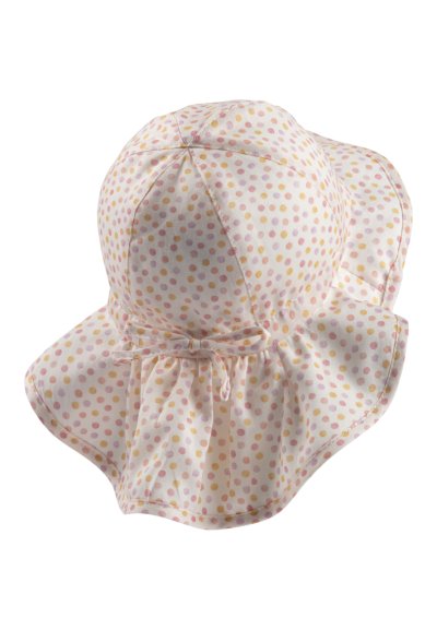 Ľahká bavlnená tkanina sa vyznačuje jemnou štruktúrou plátna. Jemné bodky sú v dievčenskej móde vždy trendy a samozrejme sa perfektne kombinujú s farebným a vzorovaným detským oblečením. Mierne zvlnený okraj klobúčika chráni oči pred oslňujúcim slnečným žiarením. Klobúčik je vybavený šnúrkami na zaväzovanie pod krkom, čo ocení každá malá princezná, ktorá nechce aby jej klobúčik padal z hlavičky. Mierne zvlnený okraj má ďalej vzadu veľkorysú ochranu krku a rovnomerne zakrýva uši a krk, pričom chráni aj oči pred príliš ostrým slnečným svetlom.