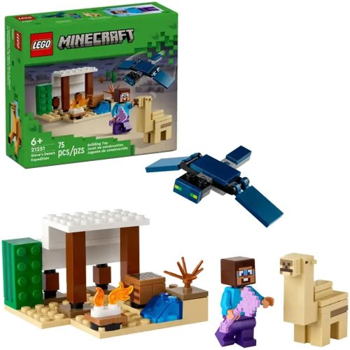 V tejto prestaviteľnej hernej stavebnici pre deti od 6 rokov nájdete 3 figúrky LEGO Minecraft, vrátane Stevea, a domček v púšti. Súčasťou sady sú tiež preslávené prvky z hry Minecraft, ako je pracovný stôl, táborák a rad dielikov na zostavenie púšte. Ide o skvelý darček pre fanúšikov Minecraftu, ktorý priamo vyzýva k tvorivým dobrodružstvám a akčným bitkám, keď základňu napadne lietajúci Prízrak s pohyblivými krídlami. Úplne prvýkrát sa v stavebnici LEGO Minecraft objavuje mláďa ťavy a nechýba ani nová verzia Steveovej tváre. Sadu je možné kombinovať s ďalšími stavebnicami z radu LEGO Minecraft (predávajú sa samostatne) a predstavuje skvelý darček pre deti i milovníkov videohier.