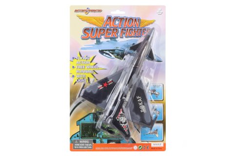 Plastová stíhačka na batérie o rozmere cca 28 x 21 cm. Po zavesení na pribalenej lanou sa stíhačka točí do kolesa. Stíhačka po zapnití svieti roztáča vrtuľku ako pohon na lietanie. Napájanie 2 AA batérie - nie sú súčasťou. Rozmer balenia cca 24 x 36,5 x 7,5 cm. Vek 5+