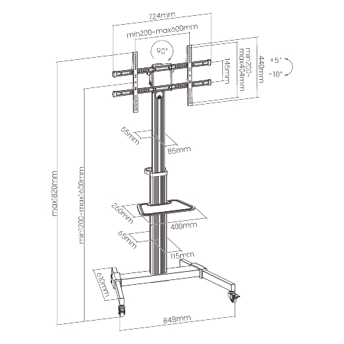 Hlavné vlastnosti: • Elegantná ľahká hliníková konštrukcia • Jednoduchá zmena nastavenia orientácie TV na výšku alebo na šírku • Jednoduché vertikálne nastavenie výšky TV • Výškovo nastaviteľná polica s nosnosťou až 5 kg poskytuje dostatok úložného priestoru pre príslušenstvo • Jednoduchá zmena náklonu TV v rozsahu +5°~-10° bez použitia nástrojov • 4 kolieska s možnosťou • Integrovaná D rukoväť pre rýchly a jednoduchý presun stojana • Vnútorné vedenie káblov rámom stojana pre ich jednoduchú organizáciu a usporiadanie • Podporované rozstupy VESA: 200x200,300x200,400x200,300x300,4000 Jednoduchá a rýchla montáž