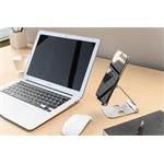 Stojanček je možné kompletne zložiť , ľahko sa tak zmestí do tašky alebo do batohu. Vložený telefón v stojane pohodlne nastavíte do správneho uhla. Pre úplné bezpečie vášho mobilného telefónu je horná časť stojana pokrytá jemným silikónom , ktorý zabráni poškriabaniu aj nechcenému skĺznutiu. V zadnej časti stojanu nájdete otvor na pretiahnutie nabíjacieho kábla .