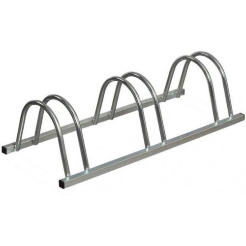 stojan pre 3 kolesá zváraný z oceľových profilov a rúrok upravený galvanickým zinkom pozdĺžny rám z profilov 25 x 25 mm oblúky ohýbané z rúrok priemeru 18 mm galvanicky pokovované pre vysokú koróznu odolnosť …